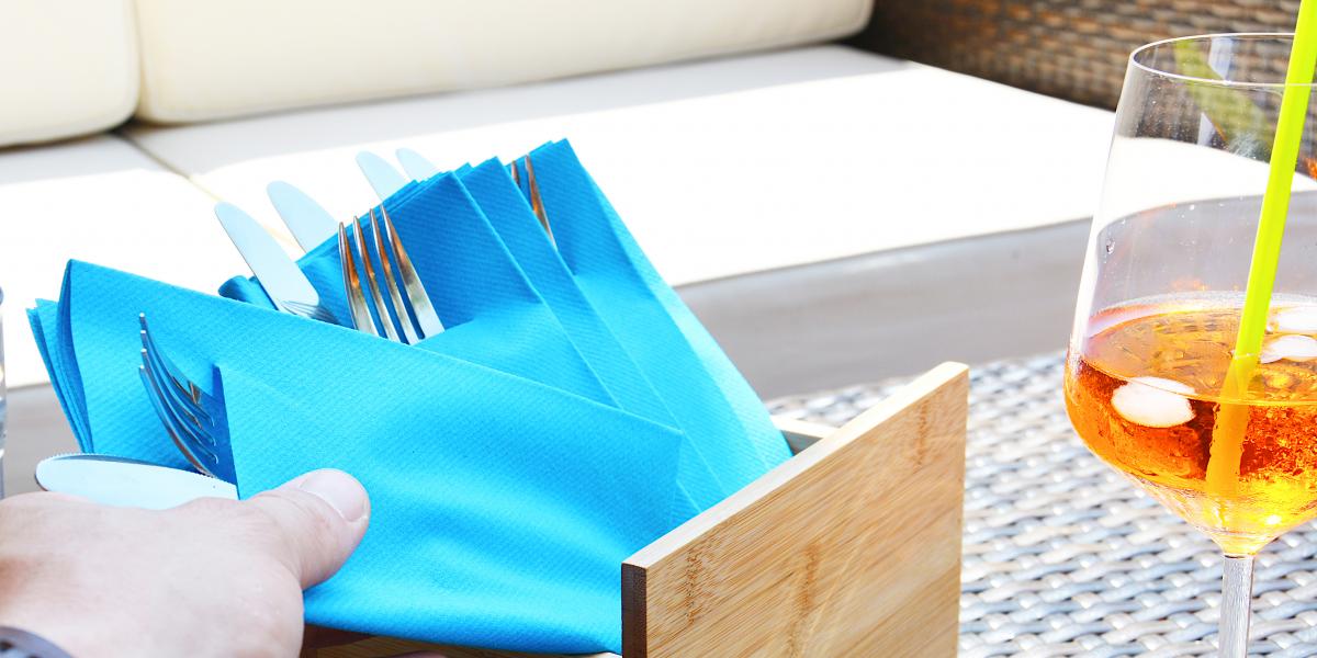 Die Bestecktaschen mit integrierter Serviette eignen sich hervorragend für das Terrassengeschäft. Es gibt sie in zahlreichen Farben und Kombinationsmöglichkeiten.